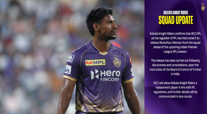 কেকেআরের প্রকাশিত এক বিবৃতিতে জানানো হয়, বিসিসিআইয়ের নির্দেশনায় তারা মোস্তাফিজকে রিলিজ করার সিদ্ধান্ত নিয়েছে। বিবৃতিতে বলা হয়, “টুর্নামেন্ট শুরুর আগে, বর্তমান প্রেক্ষাপট বিবেচনায় বিসিসিআই আমাদের জানায় যে মোস্তাফিজুর রহমানকে স্কোয়াডে রাখা যাবে না। বোর্ডের সঙ্গে আলোচনার মাধ্যমে আমরা আনুষ্ঠানিকভাবে তাঁকে রিলিজ করেছি। চাইলে তার পরিবর্তে আমরা নতুন কোনো বিদেশি খেলোয়াড় নিতে পারব, যার বিষয়ে পরে জানানো হবে।”