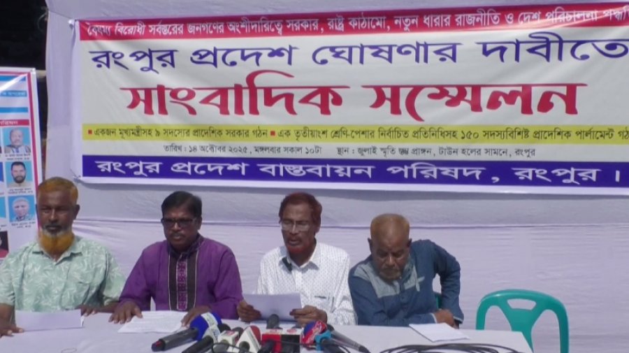 রংপুরকে প্রদেশ ঘোষণা করে একজন মুখ্যমন্ত্রীসহ ৯ সদস্যের প্রাদেশিক সরকার গঠনসহ ৯ দাবিতে সংবাদ সম্মেলন করেছে রংপুর প্রদেশ বাস্তবায়ন পরিষদ। মঙ্গলবার (১৪ অক্টোবর) সকাল সাড়ে ১০টায় রংপুর নগরীর জুলাই চত্বরে এ সম্মেলন অনুষ্ঠিত হয়।
